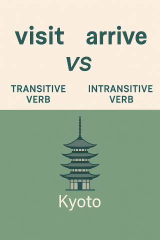 🔑 ポイント整理 visit は 他動詞→ 目的語を直接とることができる。例:I visited Kyoto.(私は京都を訪れた) arrive は 自動詞→ 目的語を直接とれない。必ず前置詞が必要。例:I arrived in Kyoto.(私は京都に到着した) 📝 練習問題 次の文ではどちらを選ぶべきでしょうか? [visit or arrive] Kyoto ✅ 答え visit ...